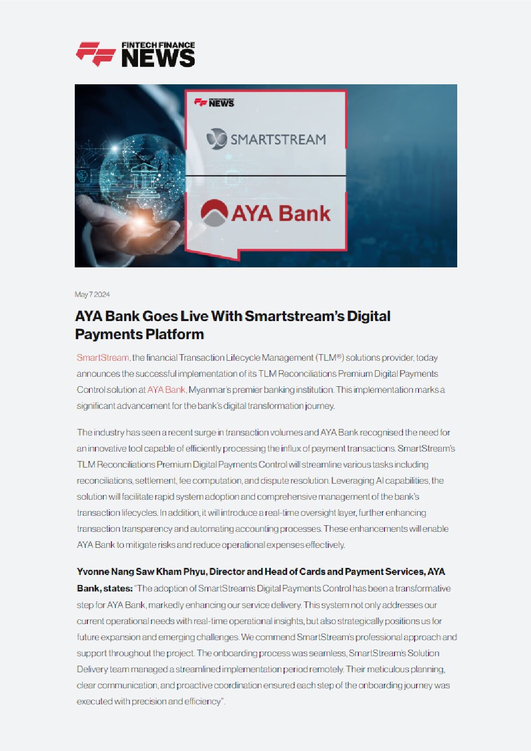 AYA Bank Goes Live With Smartstream’s Digital Payments Platform