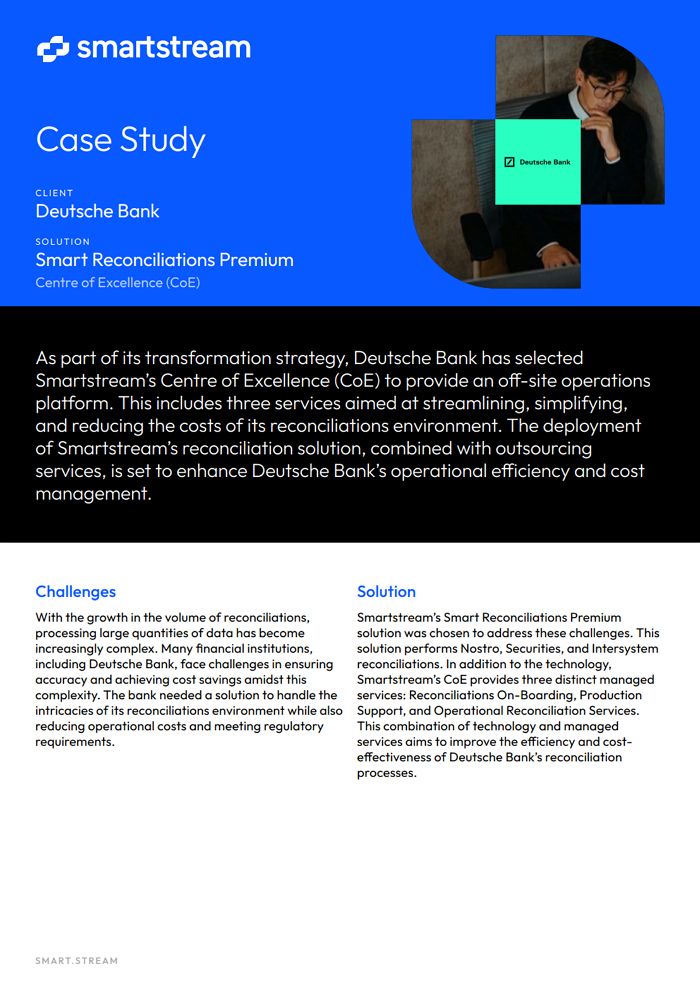 As part of its transformation strategy, Deutsche Bank has selected Smartstream’s Centre of Excellence (CoE) to provide an off-site operations platform. This includes three services aimed at streamlining, simplifying, and reducing the costs of its reconciliations environment. The deployment of Smartstream’s reconciliation solution, combined with outsourcing