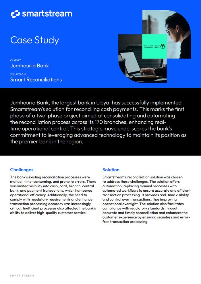 The implementation of Smartstream’s reconciliation solution has yielded significant benefits for Jumhouria Bank. Automation has streamlined processes, reduced errors, and increased efficiency. Real-time visibility into transactions has empowered the bank to manage its operations more effectively. The solution has helped the bank meet regulatory requirements, reducing the risk of non-compliance penalties. Faster, error-free transaction processing has led to an improved customer experience.