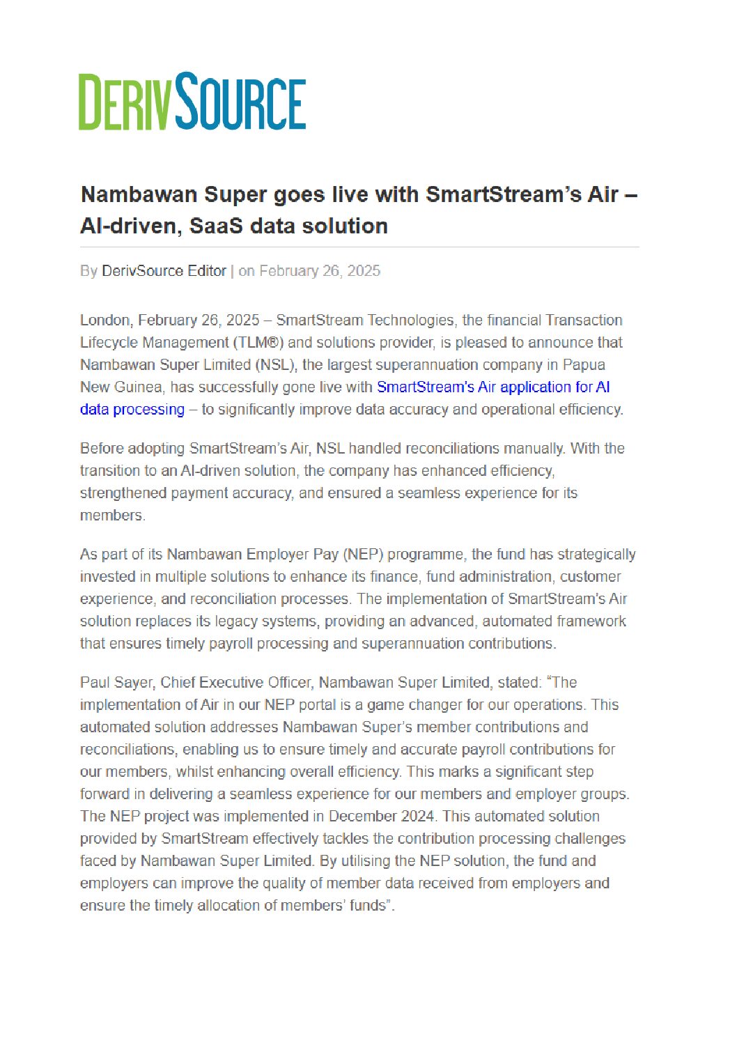 London, February 26, 2025 – Smartstream Technologies, the financial Transaction Lifecycle Management (TLM®) and solutions provider, is pleased to announce that Nambawan Super Limited (NSL), the largest superannuation company in Papua New Guinea, has successfully gone live with Smartstream’s Air application for AI data processing – to significantly improve data accuracy and operational efficiency.