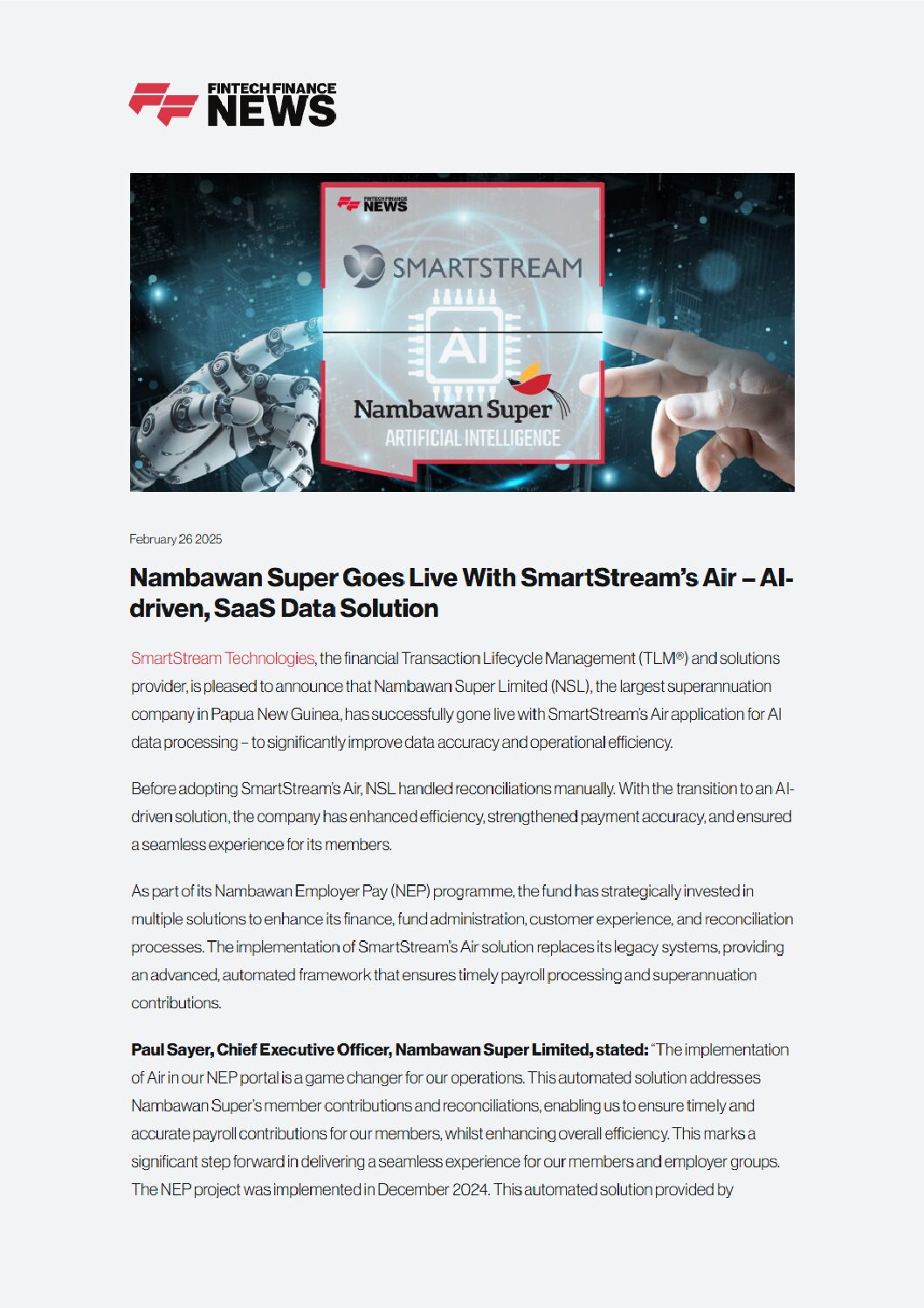 Smartstream Technologies, the financial Transaction Lifecycle Management (TLM®) and solutions provider, is pleased to announce that Nambawan Super Limited (NSL), the largest superannuation company in Papua New Guinea, has successfully gone live with Smartstream’s Air application for AI data processing – to significantly improve data accuracy and operational efficiency.