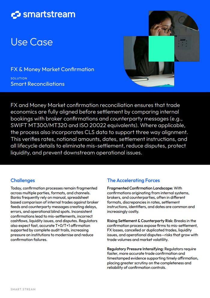 Fragmented Confirmation Landscape: With confirmations originating from internal systems, brokers, and counterparties, often in different formats, discrepancies in rates, settlement instructions, identifiers, and dates are common and increasingly costly.