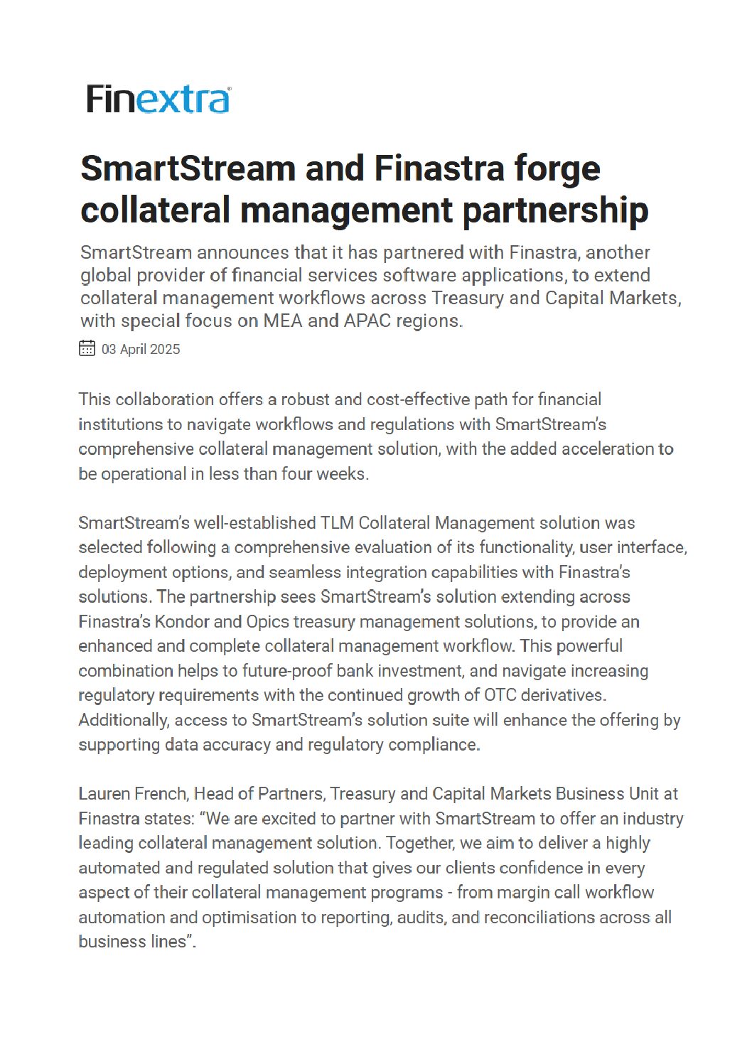 Smartstream announces that it has partnered with Finastra, another global provider of financial services software applications, to extend collateral management workflows across Treasury and Capital Markets, with special focus on MEA and APAC regions.