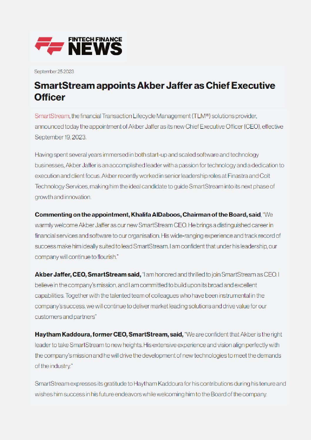 Smartstream appoints Akber Jaffer as Chief Executive Officer