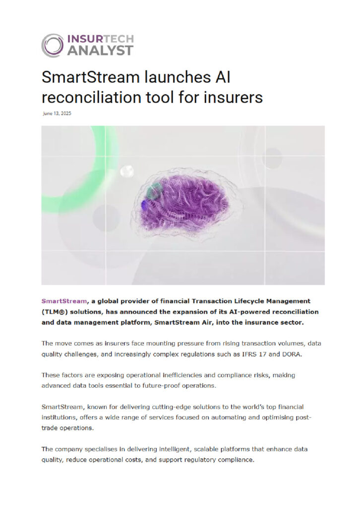 Smartstream Air is designed to reconcile and manage large volumes of data, including those from payments, reimbursements, claims, policyholder transactions, and investment operations.