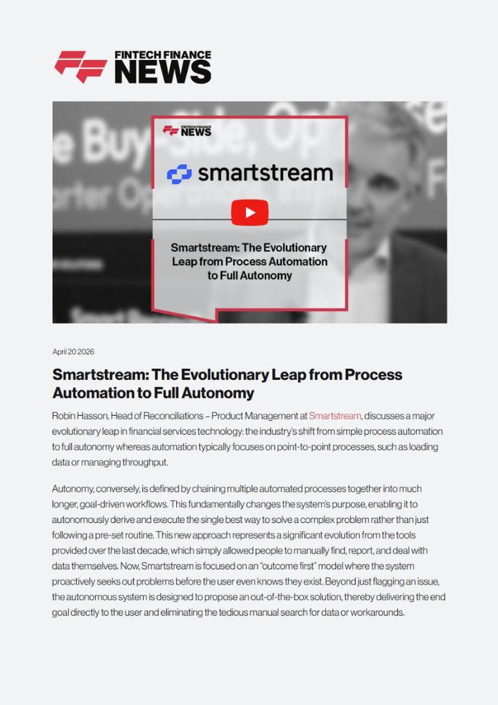 Robin Hasson, Head of Reconciliations – Product Management at Smartstream, discusses a major evolutionary leap in financial services technology: the industry’s shift from simple process automation to full autonomy whereas automation typically focuses on point-to-point processes, such as loading data or managing throughput.