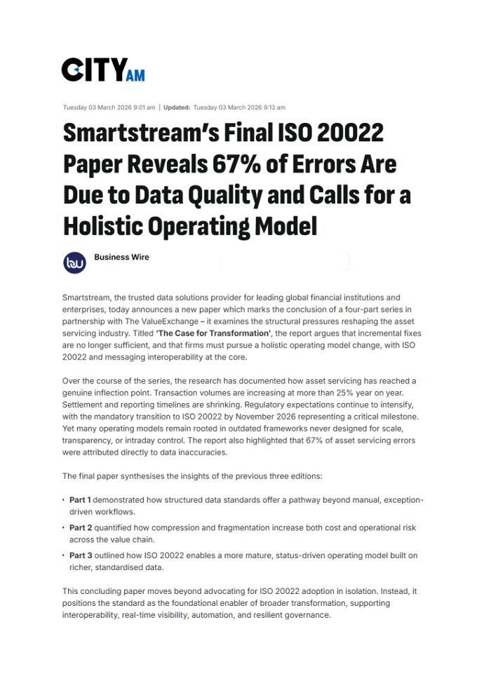 Smartstream, the trusted data solutions provider for leading global financial institutions and enterprises, today announces a new paper which marks the conclusion of a four-part series in partnership with The ValueExchange – it examines the structural pressures reshaping the asset servicing industry. Titled The Case for Transformation, the report argues that incremental fixes are no longer sufficient, and that firms must pursue a holistic operating model change, with ISO 20022 and messaging interoperability at the core.
