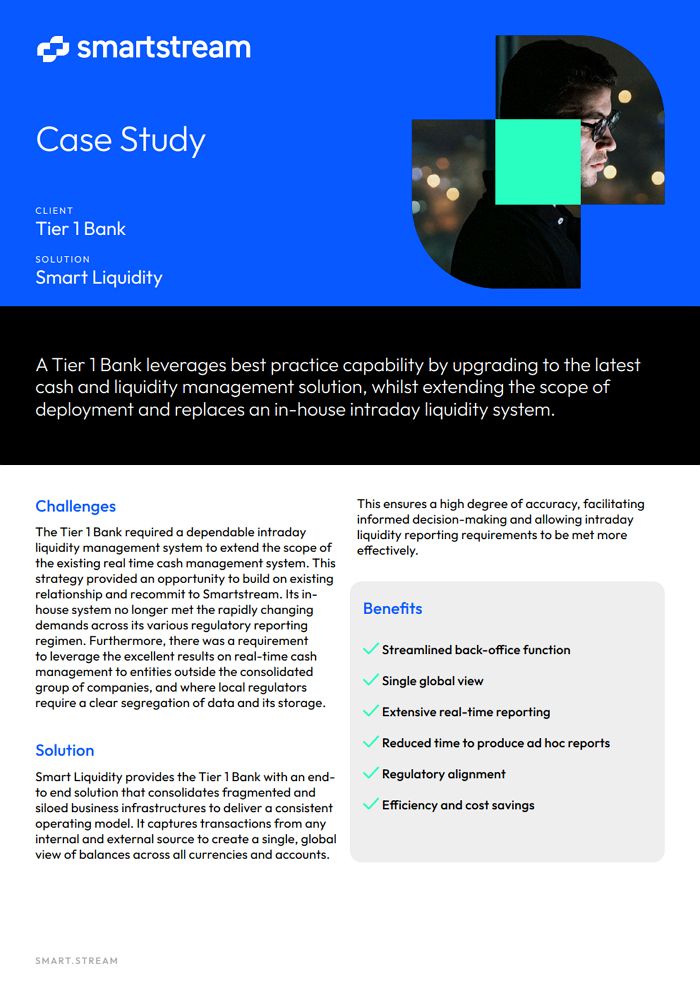 A Tier 1 Bank leverages best practice capability by upgrading to the latest cash and liquidity management solution, whilst extending the scope of deployment and replaces an in-house intraday liquidity system.