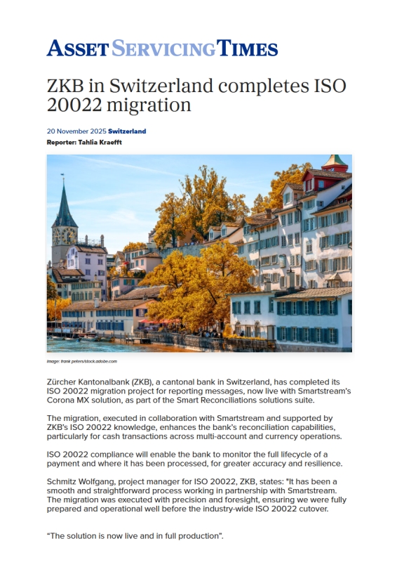 Schmitz Wolfgang, project manager for ISO 20022, ZKB, states: “It has been a smooth and straightforward process working in partnership with Smartstream. The migration was executed with precision and foresight, ensuring we were fully prepared and operational well before the industry-wide ISO 20022 cutover.